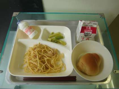 ポークトマトスパゲッティ・グリーンアスパラガスのサラダ・発酵乳・黒糖1/2パン・牛乳です。
