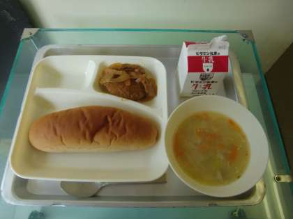 煮こみハンバーグ・コーンスープ・黒糖パン・牛乳です。