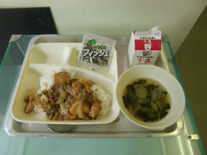 マーボーあつあげ丼・中華スープ・ミニフィッシュ・ご飯・牛乳です。