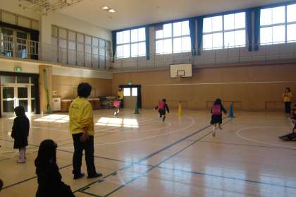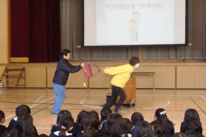 などです。どの場合の時も子どもたちはついて行かず、逃げることが出来ました。次にランドセルをつかまれた時の逃げ方についても練習しました。見本を見せていただき、これも見本通り上手に逃げることが出来ました。その後、ランドセルリレーをして、すばやくランドセルをしたまま逃げる練習もしました。20メートル逃げると、それ以上は追いかけるのをあきらめる距離なんだそうです。子どもたちは全速力で大きな声を出して逃げ切れました。