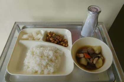 鶏肉と野菜の煮もの・じゃこ豆・かぶのゆず風味・ごはん・牛乳