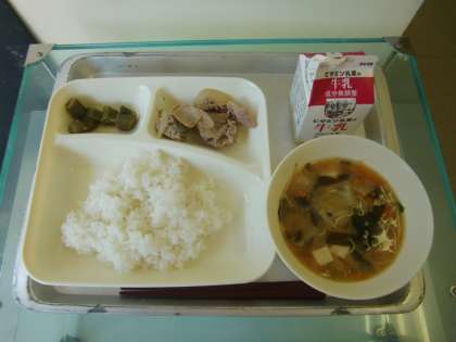 豚肉の甘辛焼き・みそ汁・オクラのおかかいため・ご飯・牛乳です。