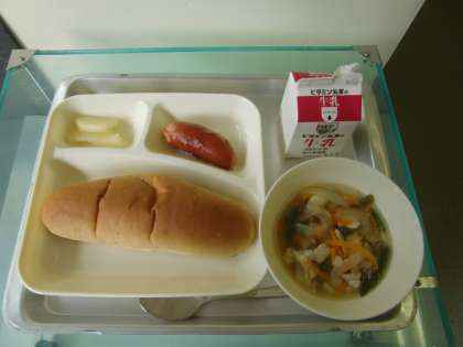 フランクフルトのケチャップソース・スープ・焼きじゃが・黒糖パン・牛乳です。