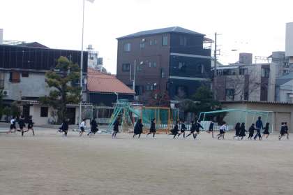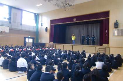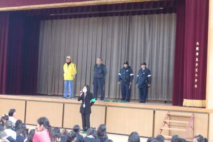 子どもたちは、緊急放送を聞き講堂へ避難します。