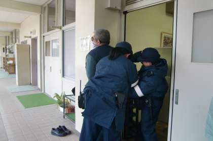 刃物を持った不審者(実は警察官)が校内に入ってきます。管理作業員さんや教頭先生たちが、不審者を教室へ行かせないように対応をします。そして校長先生・教職員が緊急事態として放送をかけたり、警察を呼んだりしました。この間に不審者は刃物を出して暴れだしますが、駆け付けた警官に無事逮捕されました。