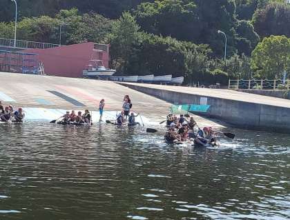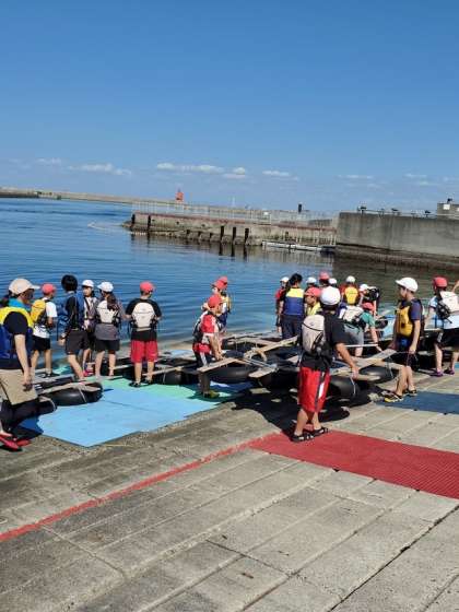 子どもたちは、『いかだ』に乗り込み、一生懸命に漕いでいます。