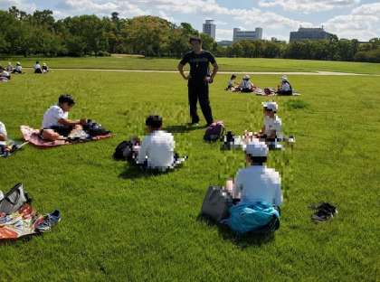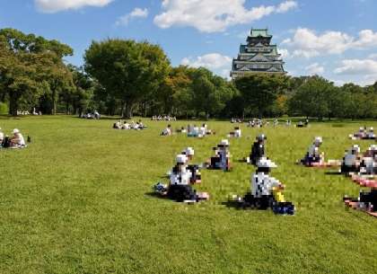 天守閣が見える緑いっぱいの広場で、少し距離を取りながら座ります。