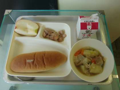 鶏肉のガーリック焼き・豚肉と野菜のスープ煮・りんご・黒糖パン・
