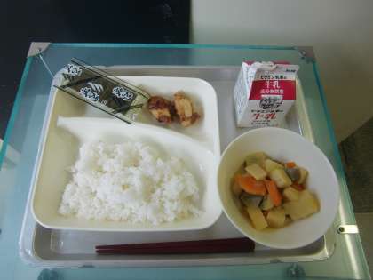 今日の給食では、八丁みそ、赤みそ、砂糖、みりん、水を合わせたみそだれをかけています。