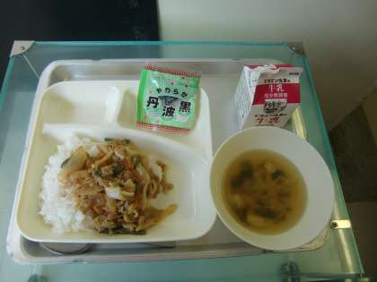ピリ辛丼・中華スープ・ソフト黒豆・牛乳です。
