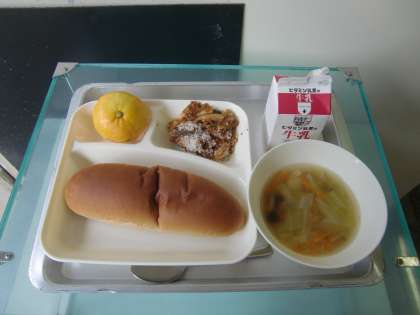 なすのミートグラタン・鶏肉と野菜のスープ・みかん・黒糖パン・