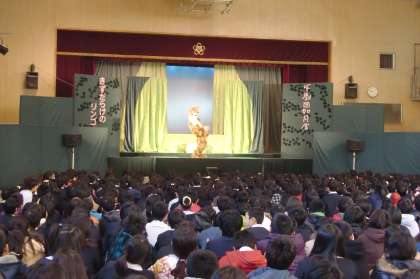 今回は劇鑑賞会として「劇団如月舎」の方々に来ていただき「きずだらけのりんご」という劇を見せていただきました。