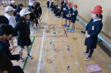 「まとあて」「わなげ」「ぱずる」「ふくわらい」「さかなつり」「ぴょんぴょんがえる」「ぼうりんぐ」「けんだま」「わりばしでっぽう」と楽しいゲームがいっぱいです。幼稚園のみなさん、楽しんでいただけましたか?2年生の子どもたちは、とても頼もしく、おにいちゃん・おねえちゃんぶりを発揮していました。