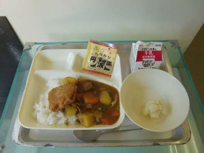 カツカレーライス・カリフラワーのピクルス・いり黒豆・牛乳です。