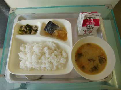 さばのみぞれかけ・みそ汁・こまつなの煮びたし・ご飯・牛乳です。
