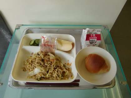 和風焼きそば・きゅうりの甘酢あえ・りんご・黒糖ロールパン・