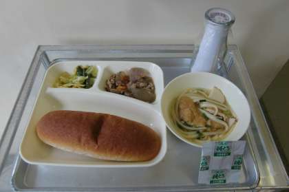 豚肉とごぼうの煮もの・なにわうどん・キャベツと三度豆のごまあえ・ごはん・牛乳です。