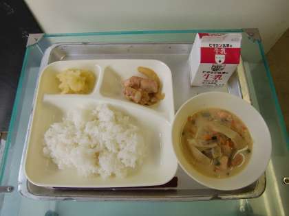 鶏肉の甘辛焼き・かす汁・くりきんとん・ご飯・牛乳です。