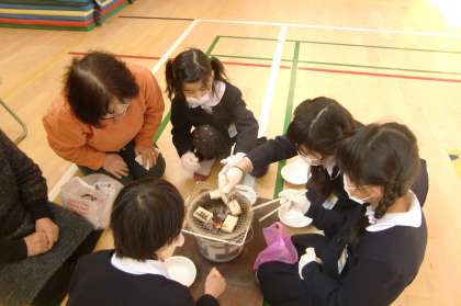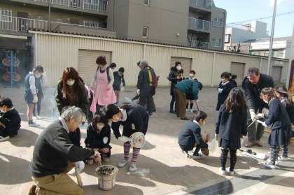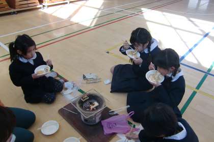 地域の方にお手伝いいただいて、七輪に火を起こします。子どもたちはうちわであおいで、炭に火が移るように頑張っていました。火が起こると、次はお餅を焼きます。七輪で焼くと、外はかりっ!中はふわっ!と焼き上がりました。焼けたお餅を、好みの味付けで食べるのですが、子どもたちは美味しそうに満面の笑みでほおばっていました。