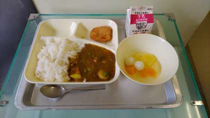 1年生の入学をお祝いした献立です。牛肉のカレーライスにカツをのせています。フルーツ白玉は、蒸したお団子を作った蜜の中にいれます。冷めたところにミックスフルーツ缶を入れて完成せす。とても児童に大人気の給食です。