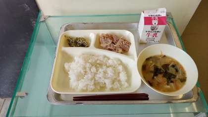 みそ汁は、とうふ・キャベツ・ごぼう・にんじん・えのきだけ・わかめと具沢山さんで彩りの良いお汁です。