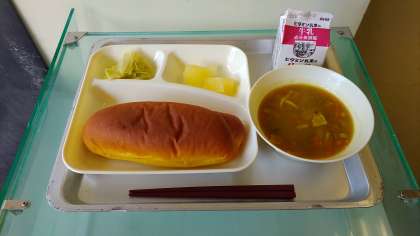 パンプキンパン カレースープスパゲッティ キャベツのピクルス リンゴ缶