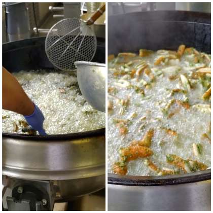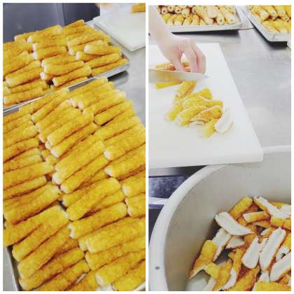 ちくわのいそべあげは、給食室で少量の水・小麦粉・青のりで衣を作り、熱した油で揚げています。ちくわを一度に入れると、かたまりやすいので、一つ一つ油の中に入れていきます。