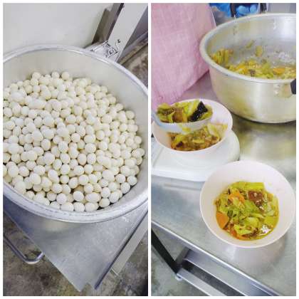 八宝菜は中国の料理です。「八宝」には、数が多いという意味があります。給食では、豚肉・玉ねぎ・キャベツ・ニンジン・たけのこ・ピーマン・しいたけ・うずらの卵が入っています。うずらの卵は、除去食です。