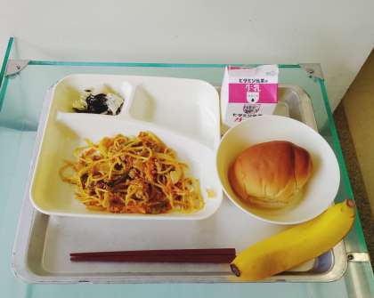 ・黒糖パン・カレースパゲッティ・バナナ・キャベツのひじきドレッシング