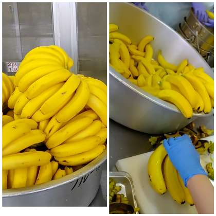 バナナは、気温や湿度の高いところでつくられます。給食のバナナは、三回洗い一本一本取っています。
