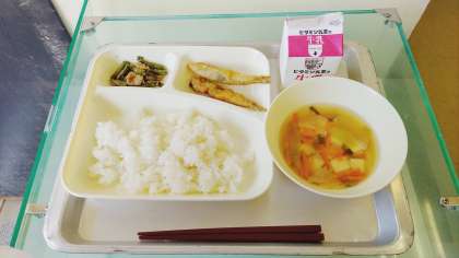 ・ごはん・いわしてんぷら・五目汁・豚肉とさんどまめのいためもの