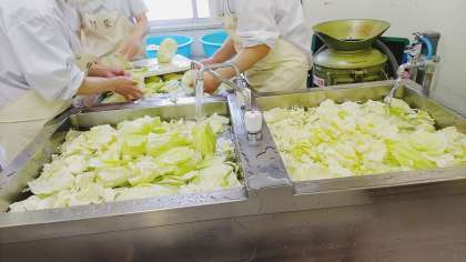 今日のキャベツは、外葉を外し、丸ごとで洗い、その後芯を取り1枚1枚丁寧に洗浄しました。キャベツに何もついていないかを確認しながら、合計3回洗浄しました。