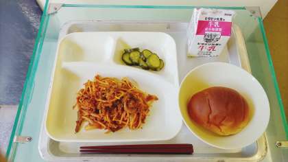 ・黒糖パン・スパゲッティミートソース・きゅうりのピクルス