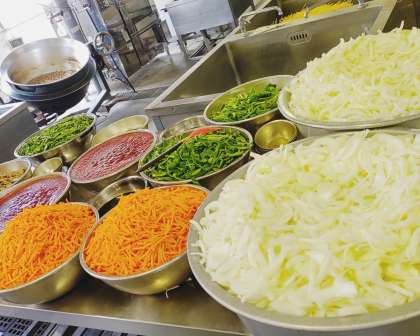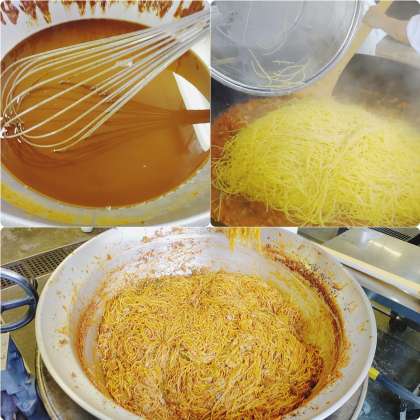 今日のルウはブラウンルウです。ルウは、綿実油と小麦粉を中火で褐色になるまで十分に炒めて作っています。