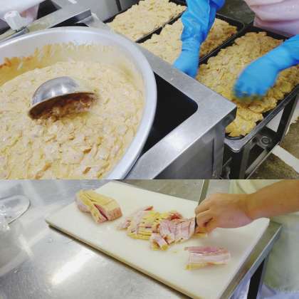鶏肉のカレーマヨネーズ焼きは、ニンニク・塩・カレー粉・マヨネーズ・ケチャップで下味を付けてから焼き物機で15分間焼いています。