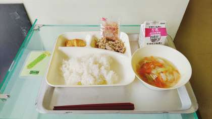 すまし汁は、鶏肉を主材にキャベツ・玉ねぎ・人参を使用しています。