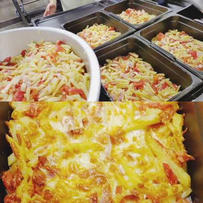 じゃがいものとトマトのチーズ焼きは、じゃがいも・ベーコン・生のとまと・チーズで焼いています。