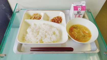 みそ汁は、とうふ・玉ねぎ・キャベツ・人参・オクラ・えのきたけを使用しています。