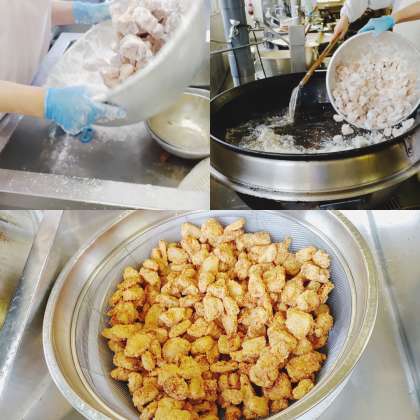 豚肉の香味あげは、豚肉(角)にしょうが汁・料理酒・濃口しょうゆで下味をつけ、でんぷんであげています。