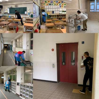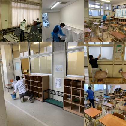 できるだけ早くに学校を再開できるよう、教職員で学校中を消毒しています。