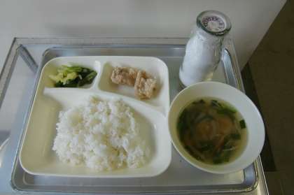 「鶏肉のからあげ」は、にんにくを効かせた下味が食欲をそそる、子どもたちに大人気の献立です。これに豚骨スープをベースに、ワンタンの皮・にら・しいたけと中華らしい食材を組み合わせたスープ・和え物を組み合わせています。