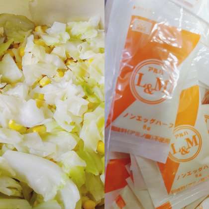 キャベツとコーンのサラダは、キャベツとコーンを各々茹でています。卵アレルギーの児童が喫食出来るように、ノンエッグドレッシング(袋)を使用しています。