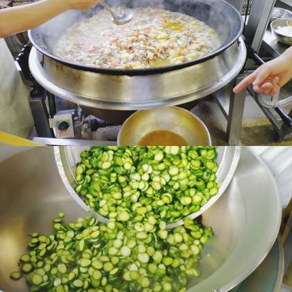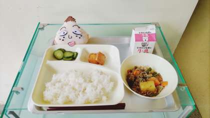 肉じゃがは、牛肉・にんじん・玉ねぎ・糸こんにゃく・じゃがいもが入っています。甘味があって児童にとても人気があります。