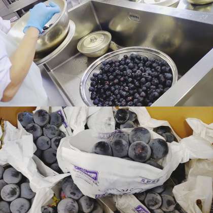ぶどう(巨峰)は、長野県産のぶどうです。大粒で種なしです。1人に3粒ずつ付きます。