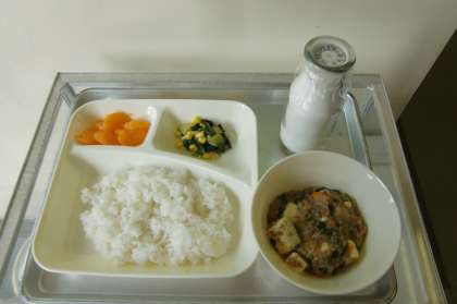 マーボーどうふ・チンゲンサイとコーンの中華あえ・みかん(缶)・ご飯・牛乳です。