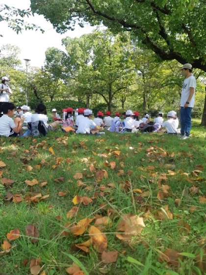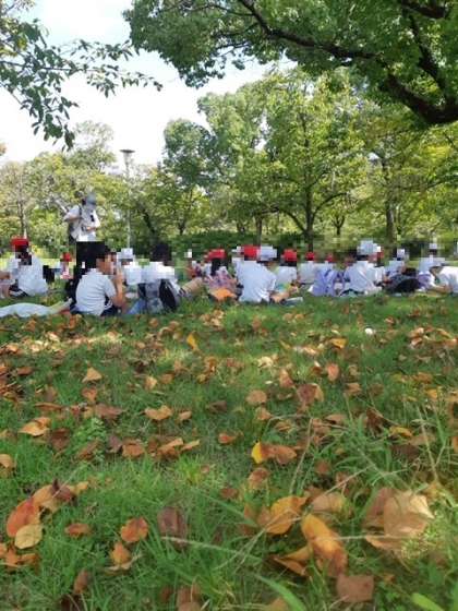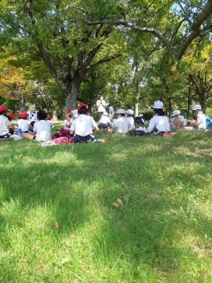 日差しがきつく、とても暑いので、日かげを探してお弁当を食べています。