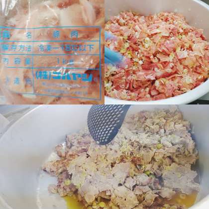 豚肉のねぎじょうゆ焼きは、料理酒・砂糖・みりん・濃口しょうゆで下味をつけた豚肉に、白ねぎを混ぜ合わせ焼き物機で焼きます。