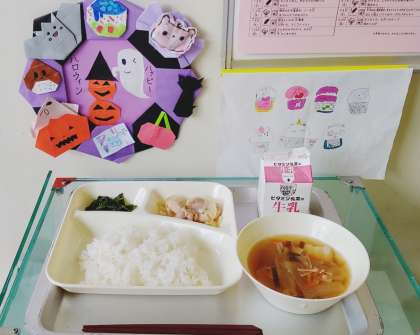 ごはん・鶏肉のゆず塩焼き・ソーキ汁・ほうれん草のおひたし