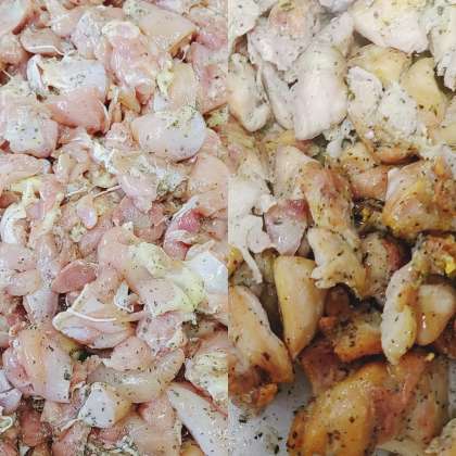 鶏肉の香草焼きは、ワイン・塩・こしょう・バジル・オリーブ油で下味をつけた鶏肉を焼き物機で焼きます。