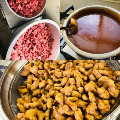 小学校で食べるみそカツは、手作りのフライです。豚肉(角)を使用しています。 タレは、八丁みそと赤みそを合わせることで、まろやかに仕上げています。八丁みそは、だまになりやすいので、一度に水分を加えず、少しずつ加えていくと溶きやすくなります。